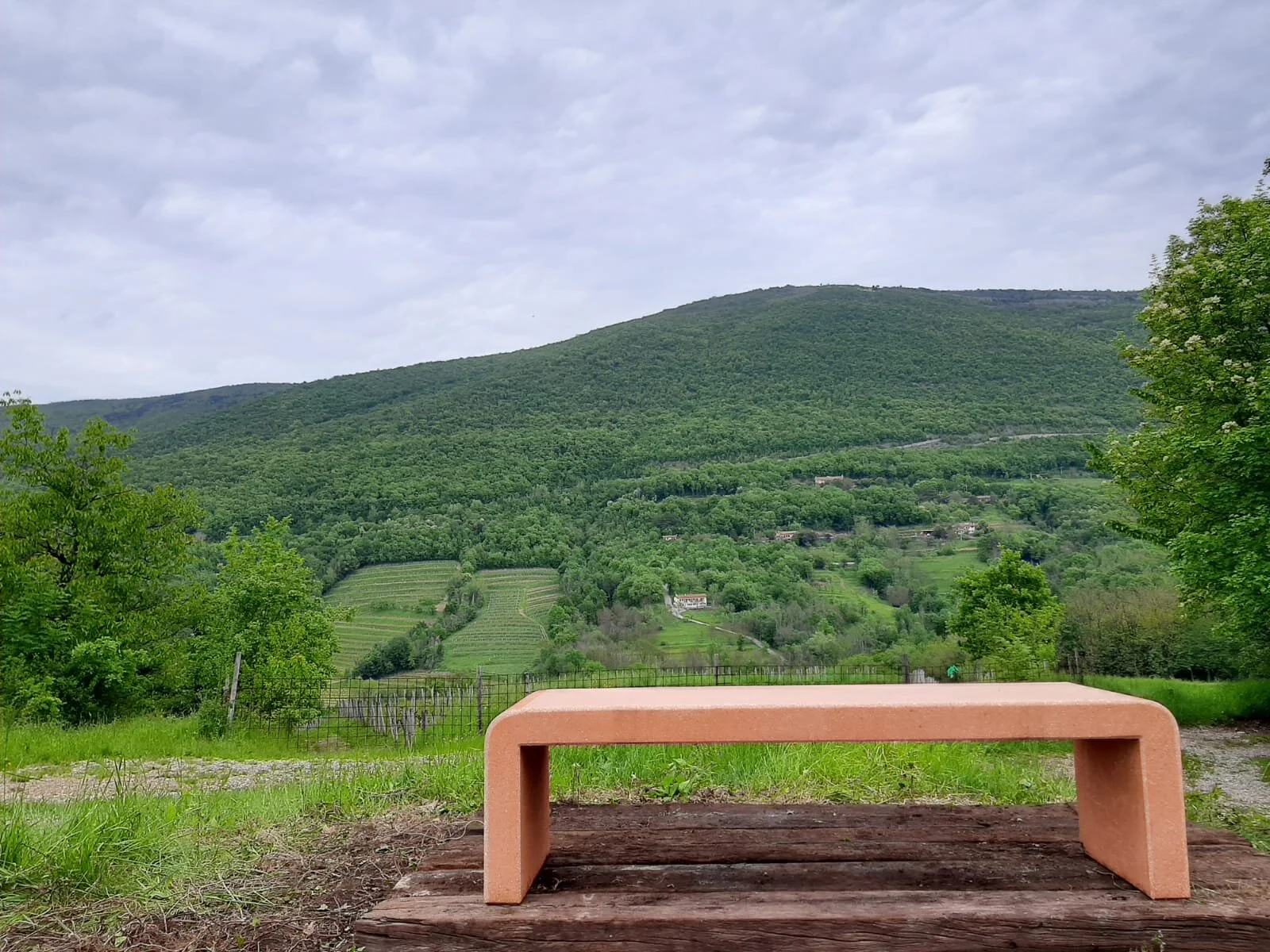 In front of the bench stands the Monte Sabotino halfway up the mountain the town of San Mauro and at the bottom the Piumiza stream which delimits on one side the territory that is part of the APRO disciplinary for the cultivation of Ribolla di Oslavia. On the left side the village of San Floriano del Collio and on the right side the two Gorizie with the monastery of Castagnevizza in the middle.